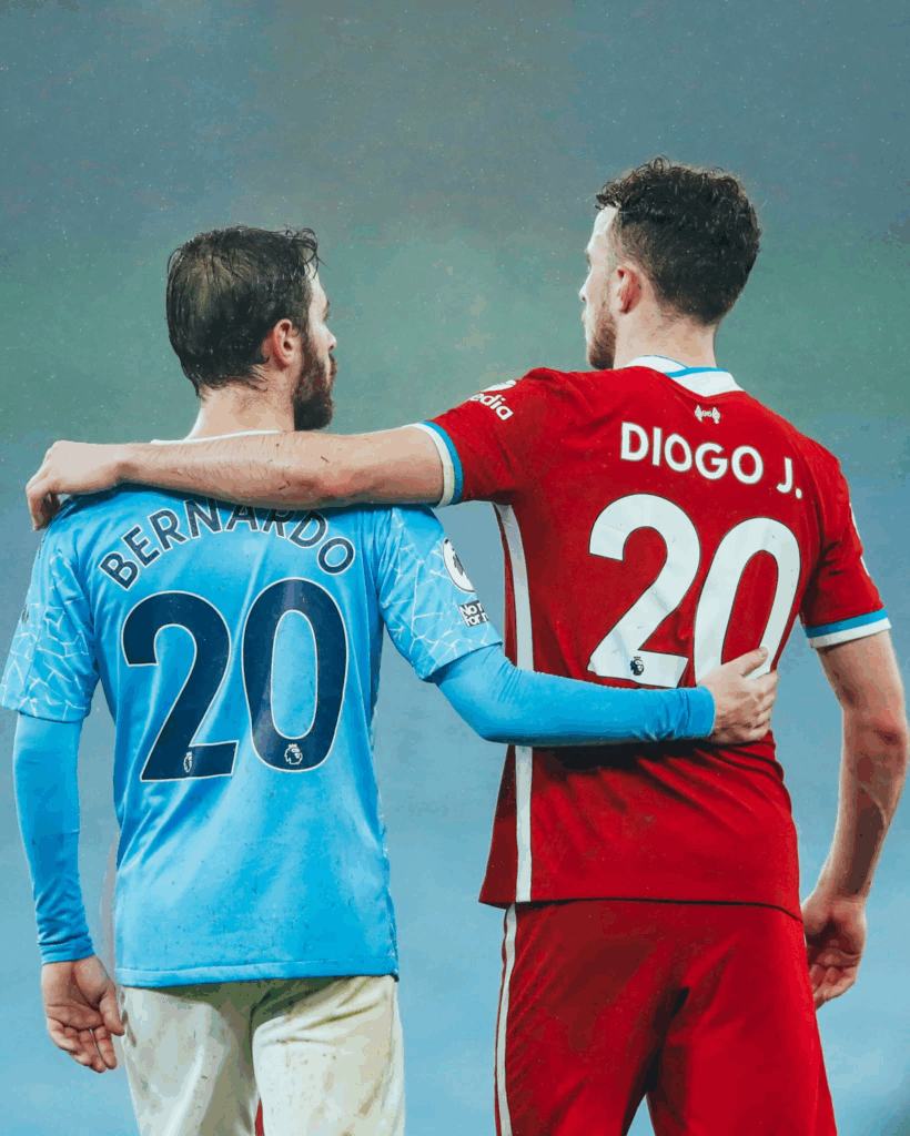 Pictured: Manchester City’s Bernardo Silva (left) and Liverpool’s late Diogo Jota (right). The two were teammates for the Portuguese national team.